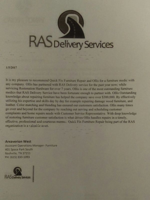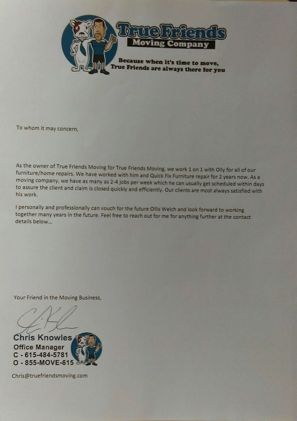 Nine years in the repair industry have taught me a lot, from 2012 to 2018 I oversaw the deluxe, inspection, and repairs to all "Restoration Hardware" furniture that was delivered in the Nashville market. I hold contracts with several moving companies in Nashville, I handle the furniture and minor home repairs that occur during moving job